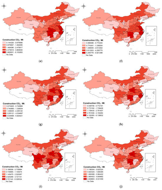 Spatial distribution characteristics of carbon emissions from 2011 to 2020: (a) represents the year 2011, (b) represents the year 2012, (c) represents the year 2013, (d) represents the year 2014, (e) represents the year 2015, (f) represents the year 2016, (g) represents the year 2017, (h) represents the year 2018, (i) represents the year 2019, (j) represents the year 2020.