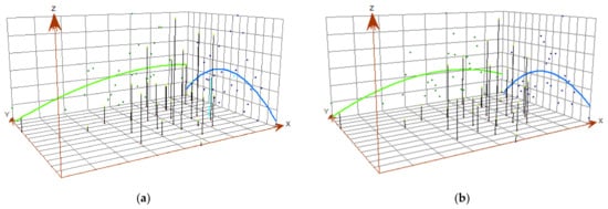 The Y-axis in the trend analysis graph represents the north–south direction, the X-axis represents the east–west direction, and the Z-axis represents carbon emissions. The blue line connects the projected points of carbon emissions in the north–south direction, while the green line represents the east–west direction. This line signifies the simulated optimal trend direction for carbon emissions in the construction industry. Connecting the projected points with lines allows us to simulate the most suitable trend direction. Upon examination, it becomes apparent that the spatial trends in carbon emissions in the construction industry are relatively consistent across provinces, thus warranting our focus on presenting the trend analysis only for 2011 and 2020. Figure 3 illustrates that there is a clear inverted U-shaped trend in the north–south direction, while in the east–west direction, emissions are lower in the west and higher in the east. This suggests that the central regions of China exhibit higher carbon emissions, gradually decreasing toward the north and south, while the western regions demonstrate lower emissions compared to the eastern regions. This aligns with the spatial distribution of carbon emissions in Figure 2. Furthermore, the trend analysis graph also indicates that as carbon emissions move eastward, the rate of increase in carbon emissions slows down, and after reaching a peak, there is a slight decreasing trend. From this observation, it becomes evident that there exists a substantial spatial disparity in carbon emissions from the construction industry among provinces in China.