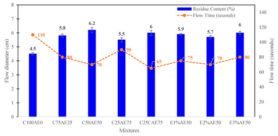 Flowability and flow time testing were carried out following ASTM C230/C230M standards [31]. A standardized flow table test was conducted, measuring the flow diameter and flow time. The CAM mixture was compacted into a cylindrical mold and placed on the flow table. The flow diameter was recorded in millimeters (mm), with the initial diameter being noted. The flow time was measured in seconds (s) for the CAM mixture to reach a specific final diameter, complying with the standard.