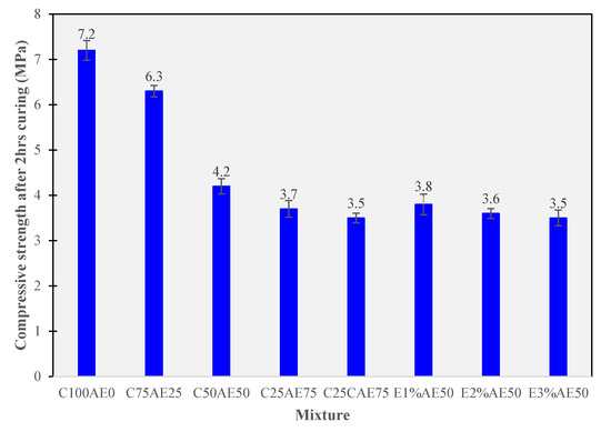 The 2 h unconfined compressive strength (UCS) test is a crucial benchmark for assessing the early mechanical performance of various CAM mixtures, particularly in the context of applications such as bridge expansion joints. Figure 4 offers a comprehensive analysis of the results, delving into each mixture composition and discussing their implications. It is important to note that higher cement content generally leads to higher UCS values, which is a fundamental consideration.