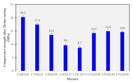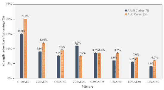 The resistance of CAM mixtures to acidic and alkali substances was evaluated as per ASTM C267-01 [34]. Specimens were exposed to specific concentrations of acidic and alkali solutions following the standard guidelines. The compressive strength variations were measured in percentage (%) to quantify the material’s resilience to chemical degradation.