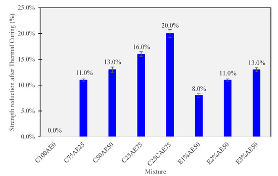 The data in Table 6 reveals several important insights. Firstly, it demonstrates that high-temperature exposure has a significant effect on the UCS of the CAM mixtures. Specifically, CAM mixtures containing higher proportions of asphalt emulsion (e.g., C25AE75 and C25CAE75) exhibited the most pronounced strength reduction, indicating their susceptibility to high-temperature conditions. This high susceptibility is supported by the highly significant p-values (p < 0.001). Conversely, mixtures with epoxy resin (E1%AE50, E2%AE50, E3%AE50) showed lower strength reductions, suggesting that the inclusion of epoxy resin can mitigate the adverse effects of high temperatures.