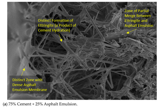 In the CAM mixture containing 75% cement and 25% anionic AE, the SEM image displays a microstructure with a dominant presence of cement particles. The asphalt emulsion phase appears as distinct droplets within the predominantly cementitious matrix. This composition results in a more cement-rich microstructure, which may impact the material’s characteristics.
