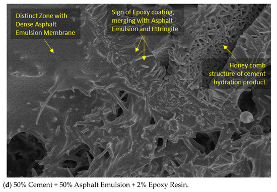 The SEM analysis of CAM mixtures incorporating epoxy resin (2%) along with anionic AE highlights the influence of epoxy resin on the microstructure. In these mixtures, the epoxy resin appears to form an adhesive layer around the cement particles and interfaces with the anionic AE droplets. This interaction contributes to a more complex and interconnected microstructure, indicating the potential of epoxy resin to improve the interface between cement and asphalt emulsion.