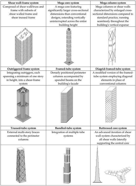 The choice of a structural system holds significant importance for optimizing space efficiency in tapered super-tall developments, as it directly influences the arrangement and dimensions of structural components. Given its more comprehensive nature compared to existing categorizations of load-bearing systems (e.g., [36]), the categorization proposed by [37] for super-tall buildings was employed in this study. The schematic representation and definitions of the structural systems used in super-tall buildings can be found in Figure 2.
