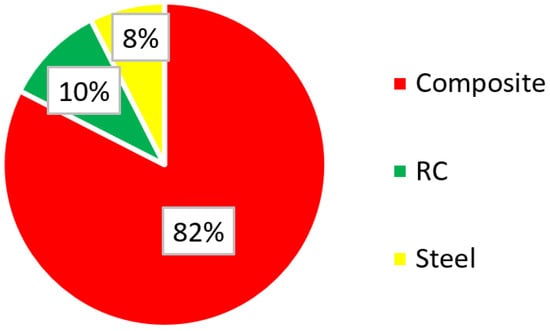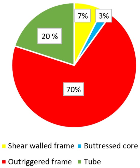As illustrated in Figure 5, most of the examined case studies predominantly employed composite construction, accounting for a dominant share of over 80%. Reinforced concrete (RC) construction followed, constituting approximately 10% of the total proportion. The widespread use of composite construction in tapered super-tall towers can be rationalized by considering the favorable amalgamation of steel’s high tensile strength and concrete’s compressive strength, in addition to the fire resistance and damping properties inherent in concrete [43]. These combined factors collectively contribute to the popularity of composite construction as a viable option for meeting the structural demands of tapered super-tall towers.