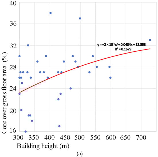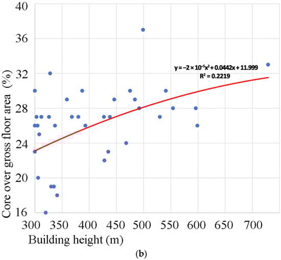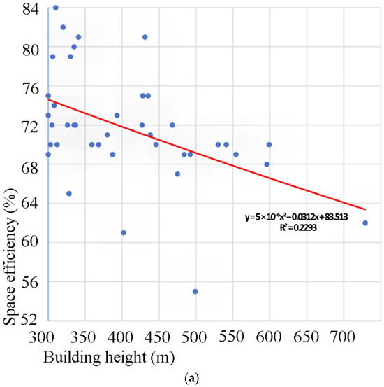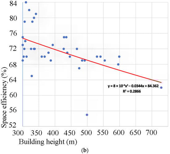 Likewise, in Ilgın’s investigation of residential towers [22], it was determined that the mean space efficiency and core-to-gross floor area ratio were 76% and 19%, respectively. The range of values encompassed a minimum of 56% and 11% to a maximum of 84% and 36%, respectively. In Ilgın’s article [23] concentrating on mixed-use super-tall buildings, it was determined that the mean space efficiency and core-to-gross floor area ratio were 71% and 26%, respectively. The range of values extended from a minimum of 55% and 16% to a maximum of 84% and 38%, respectively.