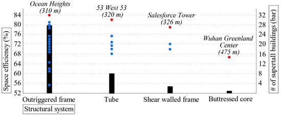 Ilgın [21] initiated a research endeavor to investigate the notion of space efficiency in 44 office skyscrapers, considering vital architectural and structural planning elements. Concurrently, a parallel undertaking involved the assessment of space efficiency in 27 residential skyscrapers, incorporating analogous design criteria [22]. Furthermore, Ilgın [23] investigated the space efficiency of 64 towers featuring mixed-use functions. The combined results obtained from Ilgın’s papers above revealed a prevalent inclination toward adopting a central core architectural typology, with outriggered frame systems emerging as frequently utilized load-bearing structures. Additionally, a significant inverse correlation between space efficiency and building height was identified.