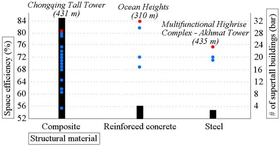As mentioned above, since structural materials exert influence on the dimensions of structural elements, they represent a vital factor impacting spatial efficiency. These materials can be categorized into three main groups: (i) steel, (ii) reinforced concrete, and (iii) composite. Considering the primary structural components to be columns, beams, shear trusses (braces), shear walls, and outriggers, and excluding floor slabs, this research employs the term ‘composite’ to describe buildings in which certain structural elements are constructed using reinforced concrete, while other structural elements are composed of steel (based on the type of structural member). Alternatively, it refers to structures where some structural elements consist of both structural steel and concrete concurrently (based on the cross-sectional composition), or a combination thereof.