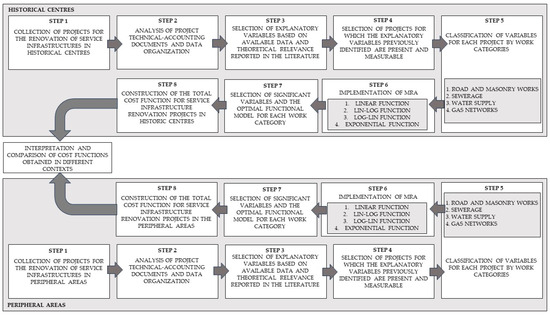 As mentioned in the introduction, from the analysis of the literature, at least three limits emerge. First, as shown in the second column of Table 1, regression models are mostly applied to estimate the costs of specific work, while there are rare cases of applications developed for urban renovation interventions that involve simultaneous works on several infrastructure networks (roads, water supplies, sewerages, and gas pipelines). In addition to those in Table 1, additional regression models aimed at predicting the construction/renovation costs of infrastructure types other than water, sewer, and gas networks have been examined, including public-interest facilities and buildings. However, the distinguishing feature of these regression models is their specificity, since they lack an integrated approach that can simultaneously involve multiple infrastructure or building categories [46,47,48,49,50]. In general, works that investigate in detail the issues inherent to multiple network infrastructures considered simultaneously are quite rare. Among the few exceptions is the work of Nuti et al. (2009), who focus on the realistic assessment of the structural safety of complex networks such as electric power, water supply, and roadways following seismic events. This paper highlights commonalities in the modelling and analysis of different infrastructures, highlighting the feasibility of the approach for analysing complex networks subject to structural hazards. However, economic-financial profile issues are only hinted at [51]. As a second limit, in most of the applications examined, the estimated cost function is also valid for intercalated projects in different urban contexts [52]. Otherwise, in the present study, two different cost functions are tested, one for historical centres and the other for peripheral areas. Finally, the last issue concerns the limited number of case studies carried out in Italy on MRA for estimating the costs of restructuring sewerage, water, and gas infrastructures.
