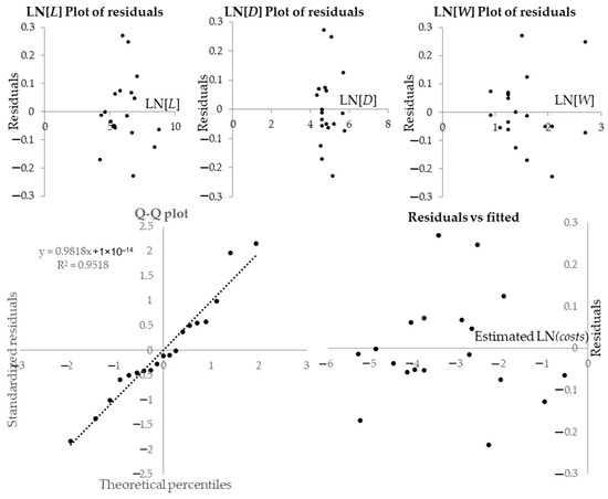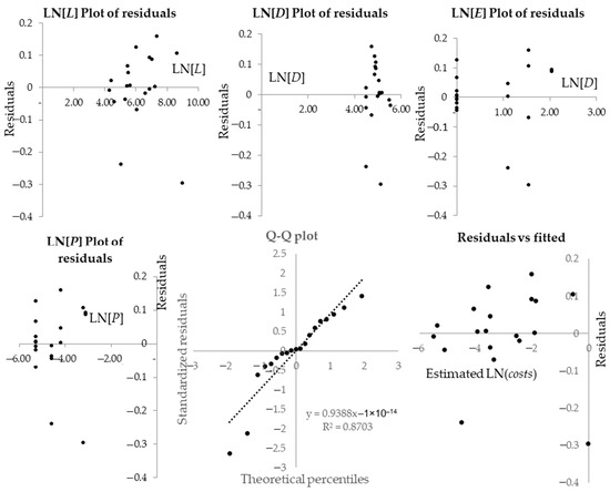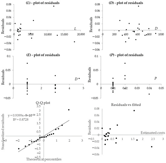 Unlike the cost function of road and masonry works, which is assumed to depend on four variables (L, S, E, and W), the cost functions of sewerage, water supply, and gas networks are assumed to depend on five variables. Firstly, the extension of the network built (L), the difficulty of carrying out the works (E), and the average width of the road section (W). These variables have already been introduced previously. Then, by the weighted average diameter of the pipeline used in the intervention (D). As in the case of road and masonry works, the coherence of the choice of the aforementioned variables is corroborated by the literature examples in Table 1. The small number of selected variables is also confirmed in the literature. In particular, one of the studies examined shows that a few geometric parameters (length and diameter of the pipelines) are sufficient to obtain sufficiently reliable cost estimates [45]. Beyond this, during the statistical analysis phase (see Section 4), steps were taken to identify and eliminate the less significant variables among those initially chosen.