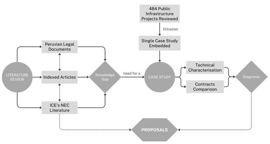 The research is based on literature reviews throughout Section 3, with the main objective of understanding and finding similarities or differences between the Peruvian State Contracting Law and NEC4 ECC. In addition, a case study of a high-impact road infrastructure project in the city of Arequipa, Peru, is developed in Section 4, which presented all the circumstances and inconveniences required by the study during its contractual execution stage. Hence, a new contribution is made regarding the benefit of improving the traditional contracting models and processes used in Peru, thus seeking to contribute to the closing of the knowledge gap of the NEC4 ECC standardised procurement model in a developing country.