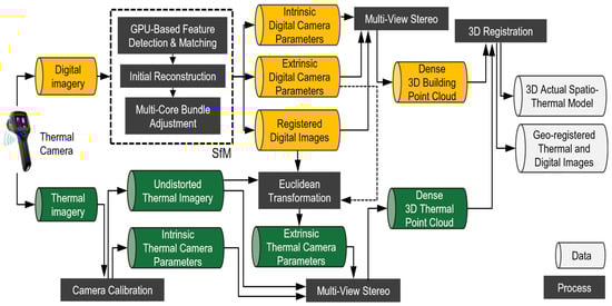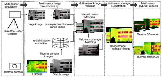 Thermographic image—laser point cloud registration workflow. Reprinted/adapted with permission from Ref. [180]. 2012, D. Gonzalez-Aguilera et al.