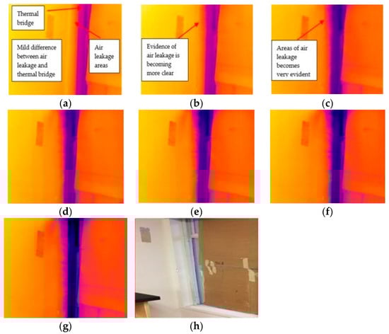 Impact of differential pressure (∆p) on surface temperature and air leakage detection using IRT. (a) 0 Pa; (b) 15 Pa; (c) 25 Pa; (d) 35 Pa; (e) 45 Pa; (f) 55 Pa; (g) 65 Pa; (h) visual image. Reprinted/adapted with permission from Ref. [185]. 2020, Milad Mahmoodzadeh et al.