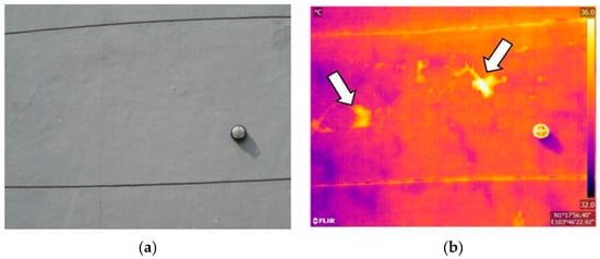 Images of delamination on a building wall during a heating cycle: (a) visual image; (b) IR image. Arrows indicate delamination areas. Reprinted/adapted with permission from Ref. [154]. 2022, Ko Tomita and Michael Yit Lin Chew.