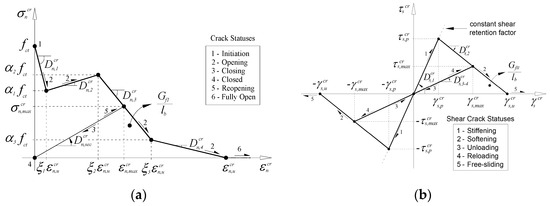 To simulate the fracture modes of SFRSCC, the NLMM104 nonlinear material model of FEMIX was used, whose corresponding diagrams are shown in Figure 5, where and are the fracture energy mode I and II, respectively. The values of the parameters of the concrete constitutive model adopted in this study are presented in Table 5. The values of the fracture mode II parameters were estimated based on previous research on the pure shear of FRC materials [64].