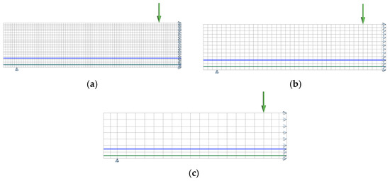 Mesh refinements adopted in the numerical simulations of experimentally tested beams by using finite elements of size (a) 25 × 20 mm2; (b) 50 × 40 mm2; and (c) 100 × 70 mm2 (width × height). Steel strand: blue line, GFRP bars: green line.