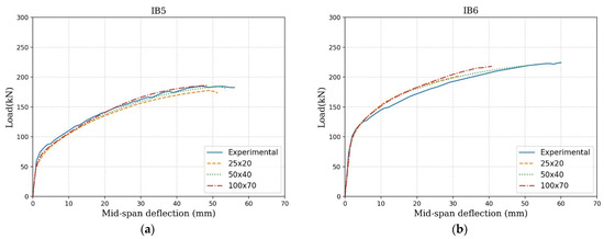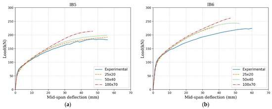 Three levels of finite element mesh refinement were utilized to investigate their impact on the simulations of the tested beams. Due to the symmetrical conditions, only one half of the I-beam is simulated. This involved using finite elements of rectangular shape and dimensions of 25 × 20 mm2, 50 × 40 mm2, and 100 × 70 mm2 (width × height). The FE meshes for IB5 can be seen in Figure 6. For modeling the SFRSCC material, plain stress Lagrangian four-node finite elements with 3 × 2 Gauss-Legendre integration points were utilized. Two-dimensional-cable-type finite elements with three Gauss-Legendre integration points, with one degree of freedom per node, were employed to simulate the steel and GFRP reinforcements in all simulations. Perfect bond conditions were assumed between these reinforcements and the surrounding concrete, which was materialized by considering the same nodes for the finite elements simulating the reinforcements and the surrounding concrete. Elements with continuous variable thickness in their nodes were used in the transition zones between the flanges and web of the beams to correctly simulate the geometry of these zones.