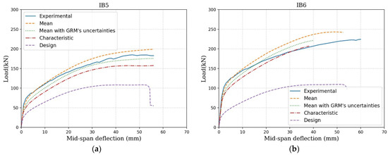 By applying these formulations, the flexural and shear design resistance of IB5 and IB6 were determined and included in Table 4. Considering the beam is simply supported (Figure 1), the design ultimate load, , was obtained, which is also included in this table.