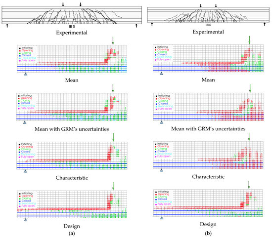 When considering the design value of the IB5 and IB6 flexural strength, their load-carrying capacities are, respectively, 163.29/1.6 × 2 = 102 kN and 170.37/1.6 × 2 = 213 kN. However, the load-carrying capacity of these beams () is limited by their shear strength, resulting in the values indicated in Table 4. These values are about 40% of the corresponding values registered experimentally, resulting in a safety factor of about 2.35. The calculated design load must be lower than the design load obtained after applying the applicable code-prescribed partial safety factors for various load combinations. This observation highlights the conservatism of the recommended design formulas for these beams according to the applied code.