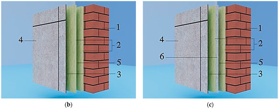 New worked-out face structures with continuous gap spacings. (a) With gap spacings: 1. load-bearing layer of brick fencing, 380 mm; 2. thermal insulation material made of expanded polystyrene, 50 and 30 mm; 3. ventilated air interlayer, 100 mm; 4. facing screen made of gray porcelain stoneware, 10 mm; and 5. closed air gap, 100 mm [35,36]. (b) With gap spacings and heat-reflecting screen in the open-air surface of the closed gap spacing: 1. load-bearing layer of brick fencing, 380 mm; 2. thermal insulation material made of expanded polystyrene, 50 and 30 mm; 3. ventilated air interlayer, 100 mm; 4. facing screen made of gray porcelain stoneware, 10 mm; 5. closed air gap, 100 mm; and 6. thin layer of aluminum foil screen [35,36]. (c) Traditional construction [37]: 1. load-bearing layer of brick fencing, 380 mm; 2. thermal insulation material made of expanded polystyrene, 80 mm; 3. ventilated air interlayer, 200 mm; and 4. facing screen made of gray porcelain stoneware, 10 mm [35,36].