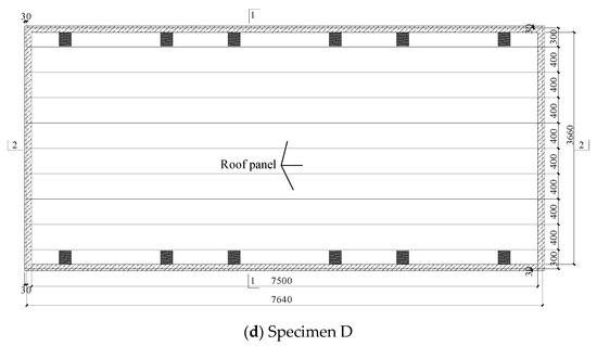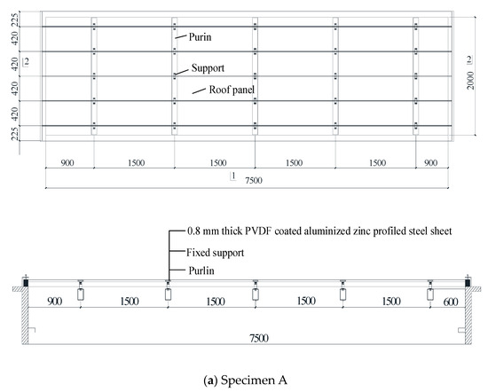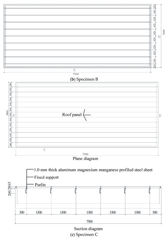 In this paper, the experimental study of the natural vibration frequency of four test specimens is carried out. The four roof systems consider different parameters, and the parameters’ influence on the roof system’s NVC is compared and analyzed. The four specimens are all standing-seam metal roof systems. The plane and section diagrams of the specimens are shown in Figure 1. The length of all specimens was 7500 mm. In specimen A, the width of the roof system and a single roof panel are 2000 mm and 420 mm, respectively. The roof system is 360° occlusion form, and the roof panel used 0.8 mm thick aluminized zinc profiled steel sheet. The purlin is a square steel tube with a cross-section length of 150 mm and a width of 100 mm. Figure 1a shows specimen A’s plane and section diagrams. In specimen B, the width of the roof system and a single roof panel are 3660 mm and 420 mm, respectively. The occlusion and structural form of specimen B is the same as that of specimen A, and the plane diagram of specimen B is illustrated in Figure 1b. In specimen C, the width of the roof system is 3860 mm, and the width and thickness of a single roof panel are 300 mm and 1.0 mm, respectively. The roof panel is made of aluminum–magnesium–manganese material, and specimen C is 270° occlusion form. The plane and section diagrams of specimen C are plotted in Figure 1c. In specimen D, the width of the roof system is 3660 mm, and the width and thickness of a single roof panel are 400 mm and 1.0 mm, respectively. The occlusion and structural form of specimen D is the same as that of specimen C, and the plane diagram of specimen D is drawn in Figure 1d.