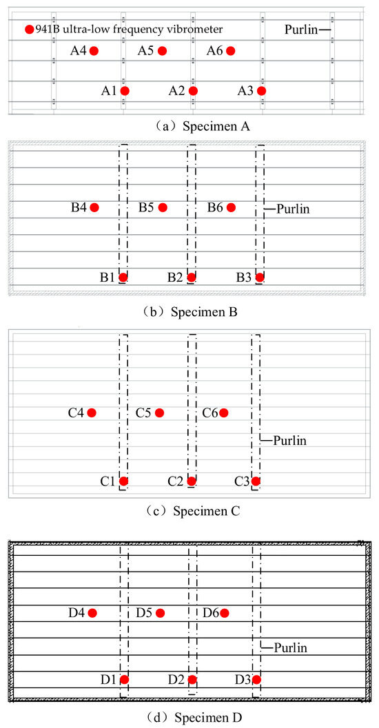 In this paper, the natural frequency of the four specimens is tested by the uTekL8916 dynamic signal analysis system and 941B ultra-low frequency vibrometer. In the four specimens, the sensors are selected at different positions of the roof panel’s side and middle span to analyze the NVC. Six sensors are arranged for each specimen, as shown in Figure 2. The sensors of A1~A6 are arranged on specimen A, among which A1~A3 are arranged at the roof panel of the side span purlin position, and A4~A6 are arranged at the non-purlin roof panel of the middle span. The sensors of B1~B6 are arranged on specimen B, where B1~B3 are set in the side span, and B4~B6 are set in the middle span. The sensors of C1~C6 are installed on specimen C, where C1~C3 is on the side span, and C4~C6 is on the middle span. The sensors of D1~D6 are installed on specimen D, in which D1~D3 are arranged in the side span, and D4~D6 are laid in the middle span. The difference between the natural frequency of the side span and the middle span roof panel and the frequency variation law at different positions along the length direction of the roof panel are compared and analyzed.