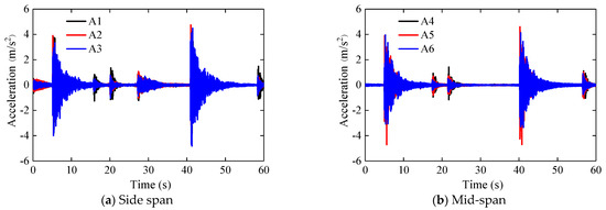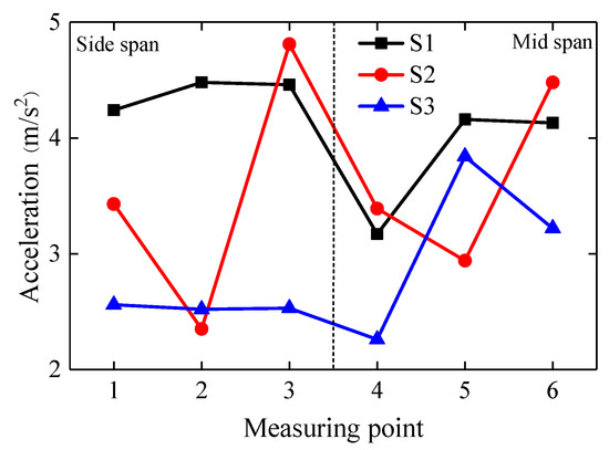 The acceleration time–history curve of case S1 is illustrated in Figure 4. The acceleration change rules of the side span and middle span are similar. The PA of sensors A1~A6 is shown in Figure 5. The PA of A1~A6 were 4.24 m/s2, 4.48 m/s2, 4.46 m/s2, 3.17 m/s2, 4.16 m/s2, 4.13 m/s2, respectively. The PA of the side span roof panel is greater than that of the middle span, and the maximum difference is 25.2%. Along the length direction of the roof panel, the PA of the side span and the middle span show an increasing trend, and the maximum decline was 5.2% and 31.2%, respectively.