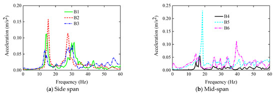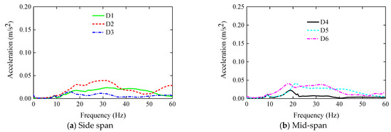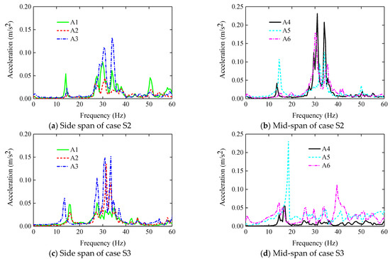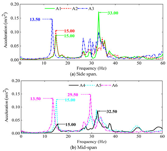 The frequency and acceleration curves of S1 are drawn in Figure 6. It can be found that the frequencies of sensors A1~A6 under the FF are 15.00 Hz, 15.00 Hz, 13.50 Hz, 15.00 Hz, 15.00 Hz, and 13.50 Hz, respectively. The frequency difference between the side and middle span under the FF is insignificant. The primary frequencies of the side and middle span appear at 13.50 Hz and 33 Hz, respectively. The natural frequency of the S1 roof panel is about 15 Hz. Compared with the reference results [14], the maximum error is about 10.2%. As can be found, the test results of this paper have a certain accuracy.