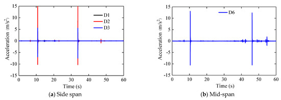 The cases S7 and S8 are considered with different panel widths and the acceleration time–history curve of S8 is plotted in Figure 14. The acceleration peaks of cases S7 and S8 are illustrated in Table 8. The PA of case S8 is greater than that of case S7. In the two cases, the acceleration at the position of sensor 3 is the smallest. The PA of case S7 appears in the side span sensor 4, and the PA of case S8 appears in the middle span sensor 2. The PA of cases S7 and S8 are 12.3 m/s2 and 15.0 m/s2, respectively. The maximum difference in PA of cases S7 and S8 in the side and middle span is 52.6% and 54.2%, respectively.