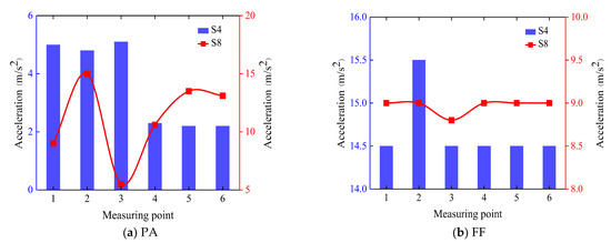 Cases S4 and S8 are selected to compare and analyze the influence of different structural forms on the NVC of the roof system. The material of the S4 roof panel is AZA, and the width and occlusion form are 420 mm and 360°, respectively. The material of the S8 roof panel is AMM, and the width and occlusion form are 400 mm and 270°, respectively. The variation of PA and FF of cases S4 and S8 are drawn in Figure 16. The PA of case S8 is significantly greater than that of case S4, and the maximum difference is 83.7%. The maximum acceleration under cases S4 and S8 appear in the side span. Along the roof panel’s length direction, each sensor’s acceleration, in the case of S8, fluctuates wildly. The FF of case S8 is the same, about 9 Hz, and the FF of case S4 is about 15 Hz. The FF of case S4 is greater than that of case S8, and the difference between the two is about 60%.