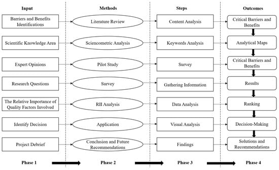 The methodology used for this research to study the benefits and barriers of using OSM in the Egyptian construction sector includes three main directions: (1) a literature review to collect the factors affecting the use of OSM (that focused on the mega projects, high quality, and fast-track projects), (2) a bibliometric analysis for the collected literature, and (3) a survey to identify the most important factors affecting OSM. A graphical illustration of the survey procedures is provided in Figure 1. In the end, the analysis took place to identify the most important barriers and benefits that need to be solved.