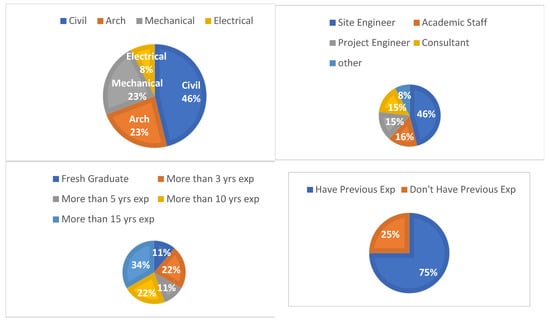 Statistics about the participants in the survey were obtained, as shown in Figure 6—the role of each participant, the department, and the number of years of experience in this field. The demographic graphs show the academic background, position, and years of experience of the selected surveyors. Most of the surveyed individuals are civil engineers (46.2%); in addition, site engineers were the most responsive (46.2%). Considering the years of experience, individuals of 15+ years of experience were crucial for the study and represented 33.3% of the responses, while fresh graduates represented 11.1% of the responses.