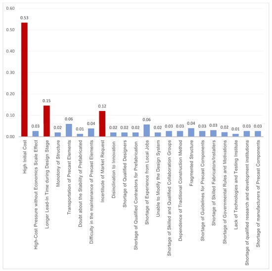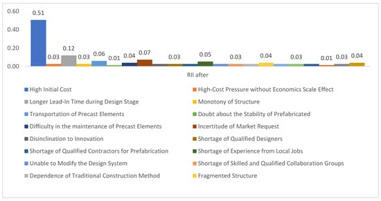 Prior to integrating BIM as a tool with OSM, four critical factors were identified, which posed challenges in terms of resolution. However, with the inclusion of BIM, three of these factors were successfully addressed, leaving only the issue of high initial cost as a critical factor that required attention [,,,]. As shown in Figure 10, after the integration of BIM and OSM, it is noticeable that some factors lose their weight and heaviness within the survey. This is due to several reasons, namely facilitating BIM and overcoming several obstacles in the way of implementing OSM in general. The integration of two technologies has become a necessity and a duty to reach the goal through the desired means. The use of BIM facilitated the factors that have a significant impact on the ease of work for everyone.