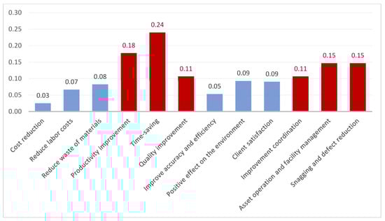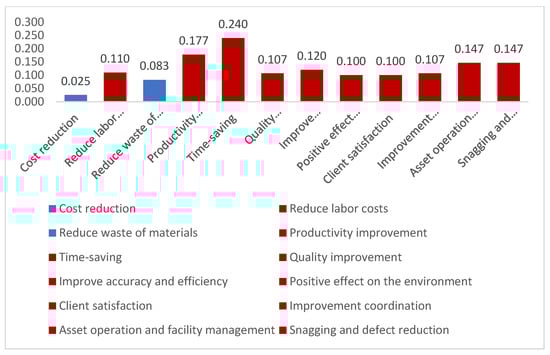 As shown in Figure 7, “High initial cost”, “Longer lead time”, and “Incertitude of market request” are the main three critical factors that affect applying OSM to the construction sector in Egypt due to many reasons according to experts and engineers. The analysis shows a huge difference between high initial costs and other factors. Also, Figure 8 shows that “Time-saving”, “productivity improvement”, “Asset operation”, “Snagging and defect reduction”, “improvement coordination”, and “Quality improvement” are the main critical benefits of applying OSM in the construction industry in Egypt [].