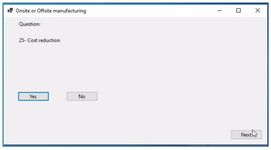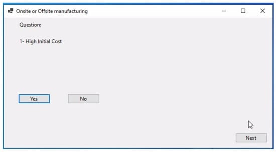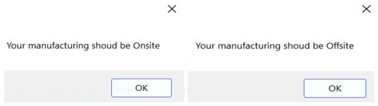 Multi-criteria decision-making models have been discussed in several previous studies [,,,,,] To support decision-making between OSM and on-site, an application was created to support decision-making by analyzing the data extracted from the RII after the survey and entering them into the application based on the work coordinates in the research paper that depends on the question of influencing and non-influencing factors to approve the start of the project in OSM or on-site construction [,,,].