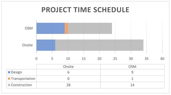 As shown in Figure 14, a case study was applied to compare the schedule of a project in the new capital city of Egypt to show the difference between applying the two methods to the same project. As it is clear, there is a huge difference between the use of OSM and off-site in terms of the age and duration of the project, unlike many other comparisons, such as the quality difference between the use of the two methods, which of course will go in favor of OSM. Using OSM in the construction process makes the project finish after only 24 months, while using the old method, which is on-site, makes the project finish after 34 months. It is clear how much time is saved.