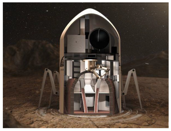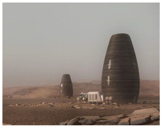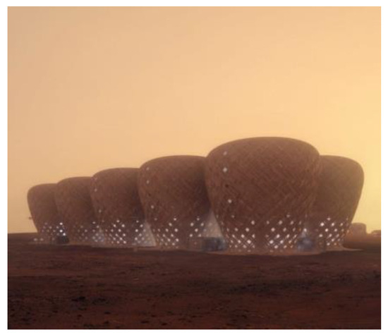 - Reedie, J. Building for Mars: Four Designs to Support a Colony on the Red Planet. 2023. Available online: https://www.architectureanddesign.com.au/news/four-creations-for-life-on-mars (accessed on 12 November 2023).