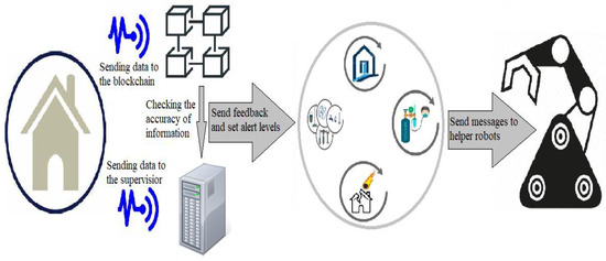 As it is clear from Figure 7, at first, the data of Martian buildings is sent to it for storage on the blockchain platform. At the same time, the data is also sent to the supervisor, and after receiving the information, the supervisor compares it with the data stored in the blockchain, and if the data is correct, the alarm level of that house is determined. After determining the warning level, if necessary, a message is sent to the rescue robots to refer them to the desired location for assistance.
