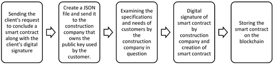 The first stage of the platform presented is the stage of signing a contract with customers, which should be conducted using a smart contract. These steps are as follows: first, the customer sends a request for a contract to the construction company, and the company sends and signs the contract after checking the profiles of the people or customers. The stages of the contract are shown in the figure below. It is worth noting that all the steps include the transactions presented in the previous section. Therefore, in these operations, no transaction should remain incomplete and should be completed. In fact, either a transaction or a step is completed and stored in the blockchain, or no transaction is made.