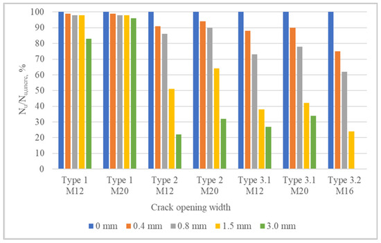 The largest bearing capacity reduction is demonstrated by failure mechanisms dealing with the concrete interface failure (type 3: the failure mechanism of anchor slipping from the hole drilled in concrete; type 4: the mechanism of debonding between the adhesive compound and the surface of concrete in the drilled hole). In these cases, load transfer mechanisms include friction and adhesion, whose values go down greatly as the crack opening width increases.