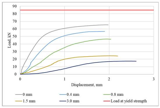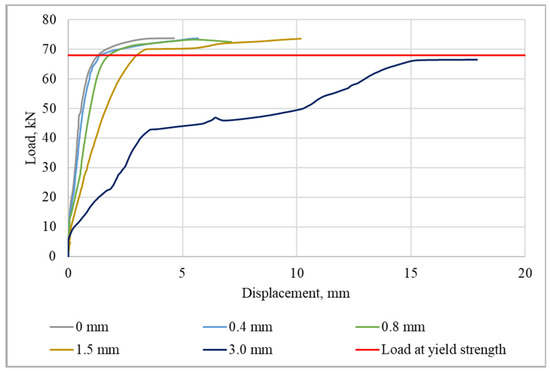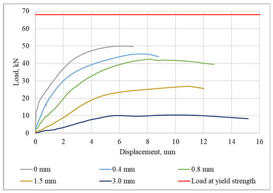 Load–displacement diagram for anchors (type 2, diameter 20 mm) in a crack with the width of 1.5 mm and the anchorage slippage failure.