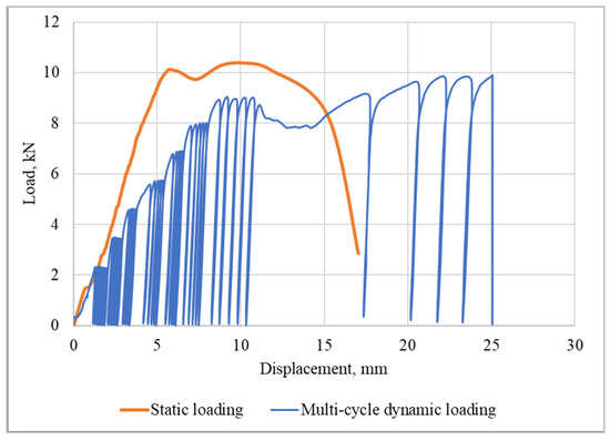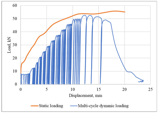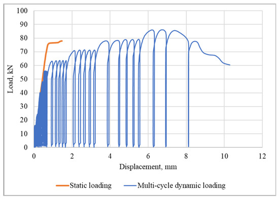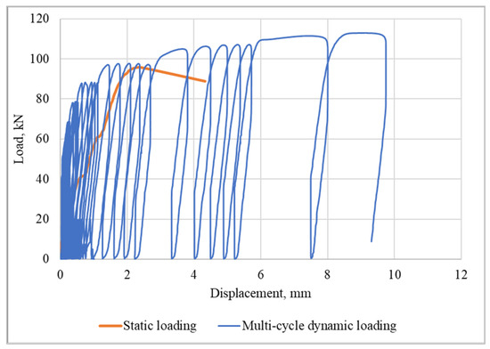 If the anchorage failure mechanism is the full slip of an anchor relative to concrete (Figure 11 and Figure 12), patterns of failure under the action of static and multicycle dynamic loading are quite similar. The elastic–plastic mechanism of failure is implemented. The failure load of the anchor is defined by the friction force at the interface between the surfaces of metal and concrete. When anchors are subjected to multicycle dynamic loading, a 5–10% decrease in the failure loads of the anchors is noticed. An increase in displacements under the 9 kN loading (Figure 11) triggers minor anchor slip reaching 5 mm; further, the anchor is caught on asperities inside the hole, and then loading increases up to complete anchor failure.