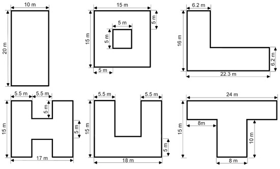 The study compares the structure with and without windows. For the unglazed system, it analyzes six different building types with four orientations, which yields 24 cases. For the glazed system, Table 1 summarizes the used possibilities. There are six building shapes, depicted in Figure 4. There are four orientations of the building, N, E, S, or W. We examined five glazing areas, namely 5%, 10%, 15%, 20%, or 30% glazing area of the floor area. Five distribution scenarios were used in the study. Finally, we generated five window-distribution scenarios for each building shape, orientation, and glazing area. In each scenario, the windows were distributed into two of the five surfaces (N, E, S, W, and the horizontal roof), with half of the windows.