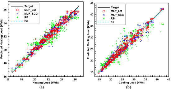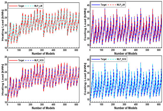 This study applied MLP and RB neural networks with three algorithms (LM, SCG, and RB) described in Section 2 to simulate the HL and CL of the residential building. The algorithms were implemented using MATLAB R2020b and IBM SPSS 20 statistics software. The dataset used to train the proposed network consisted of 624 samples, with seven independent factors affecting the HL and CL values, as explained earlier. A 70, 15, and 15 split was used to divide the data into training, testing, and validating sets, respectively. The performance of the models was evaluated using R2, MAE, and RMSE, which are widely used in the literature [36]. To obtain the optimal structure of the models, an extensive trial and error process was conducted. The prediction results of each model for the HL and CL values were presented and discussed in detail.