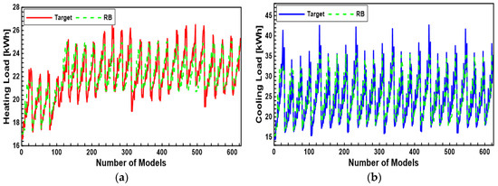 The predicted data values per model number for the (a) heating load on the left side and (b) cooling load on the right side, through MLP_LM, MLP_SCG, and RB with target.
