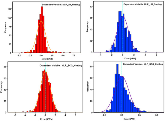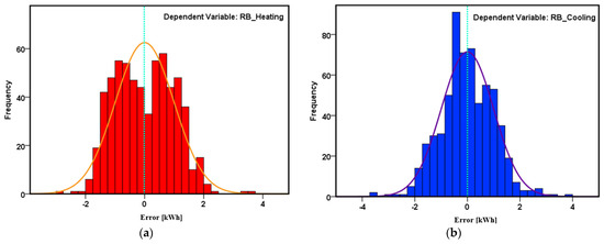 Histogram error for (a) heating load and (b) cooling load prediction through MLP_LM, MLP_SCG, and RB.