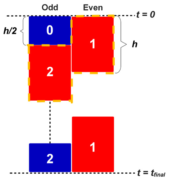 Figure 9 illustrates the space–time structure of the leapfrog–hopscotch (LH) method [18]. The method has two half- and several full-time steps. The first step is a half-time step for the odd nodes, using the initial values. This is shown by a blue half-rectangle in the figure. Then, the method alternates full-time steps (red rectangle in the figure) for the even and odd nodes until the end. The last step is a half-time step for the odd nodes, to match the final time point of the even nodes. This is shown by a blue half-rectangle in the figure. The key point is that when we calculate the value of node i, we use the latest values of its neighbors i − 1 and i + 1 in the equations.