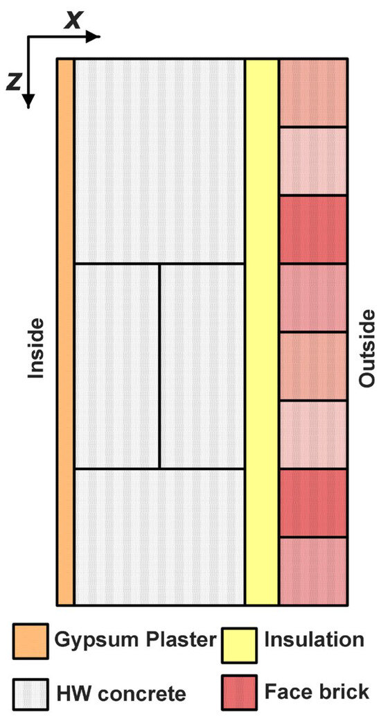 A cross-section of a wall is considered with dimensions 42 cm in the x and 100 cm in the y and z direction, as can be seen in Figure 10. The four layers consist of gypsum plaster, heavy weight concrete, insulation, and face brick. This wall structure is the same and has the same U value as used in Section 3.1.