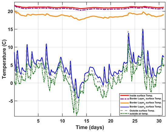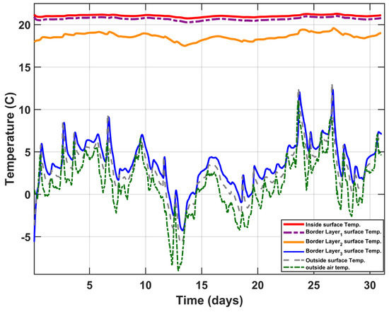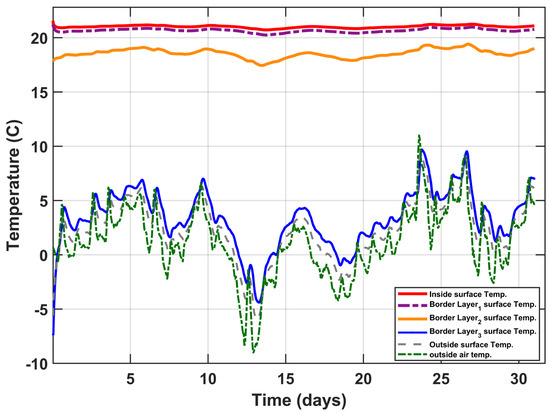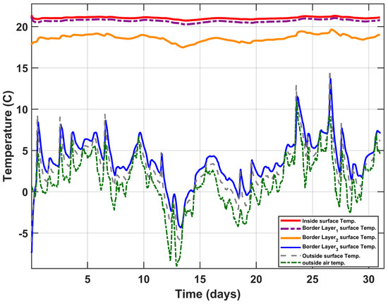 Convective and radiation heat transfer occur in the x-direction, which is the direction of heat transfer depicted in Figure 10. Table 6 summarizes the boundary inside and outside condition of heat transfer for winter season convection coefficients (), temperature and emissivity (ε) of the surfaces for the inside constant conditions and for the outside changing with time depending on the ambient conditions. The inside boundary condition is taken to be the constant comfort zone, which is taken from [29]. The outside condition changes with time depending on the changing weather conditions. The ambient air temperature, velocity, and the total solar radiation are taken according to real weather conditions in Miskolc city from 1st December 00.0 a.m. to 31st December 00.0 p.m. [40]. Table 7 shows the boundary condition for the summer season and the data are taken according to real weather conditions in Miskolc city from 1 July 00.0 a.m. to 31 July 00.0 p.m. [40].